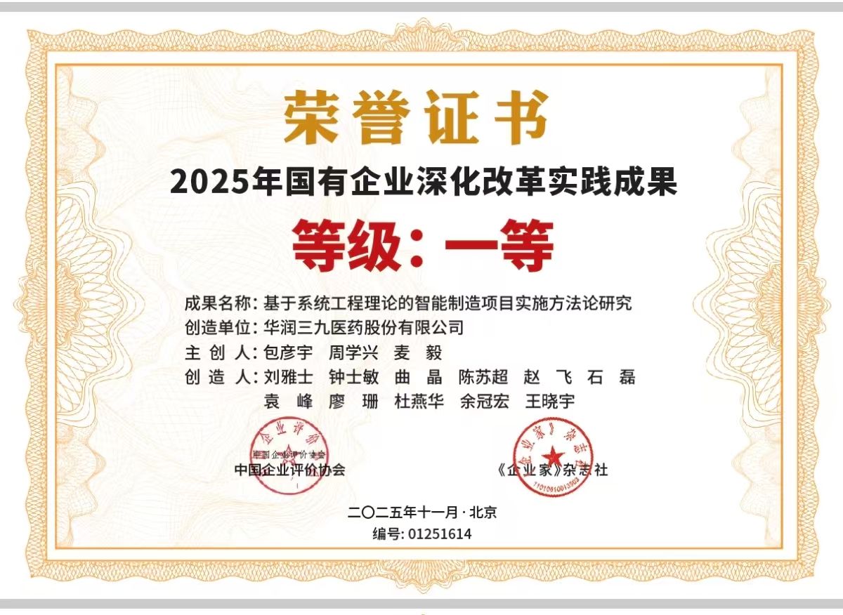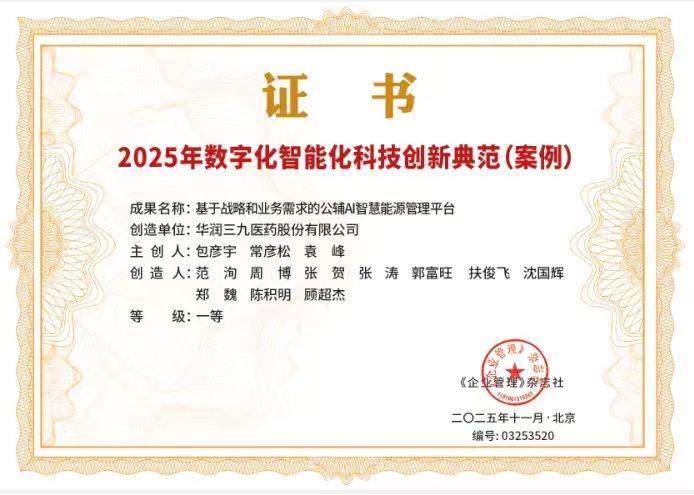 近日,2025企业改革与发展创新实践交流会暨优秀企业管理实践成果(案例)发布会在北京召开。会上,华润三九两项实践成果(案例)分别荣获一等奖。其中,“基于系统工程理论的智能制造项目实施方法论研究”课题荣获“国有企业深化改革实践成果一等奖”,“基于战略和业务需求的公辅AI智慧能源管理平台”项目荣获“数字化智能化科技创新典范(案例)一等奖”。