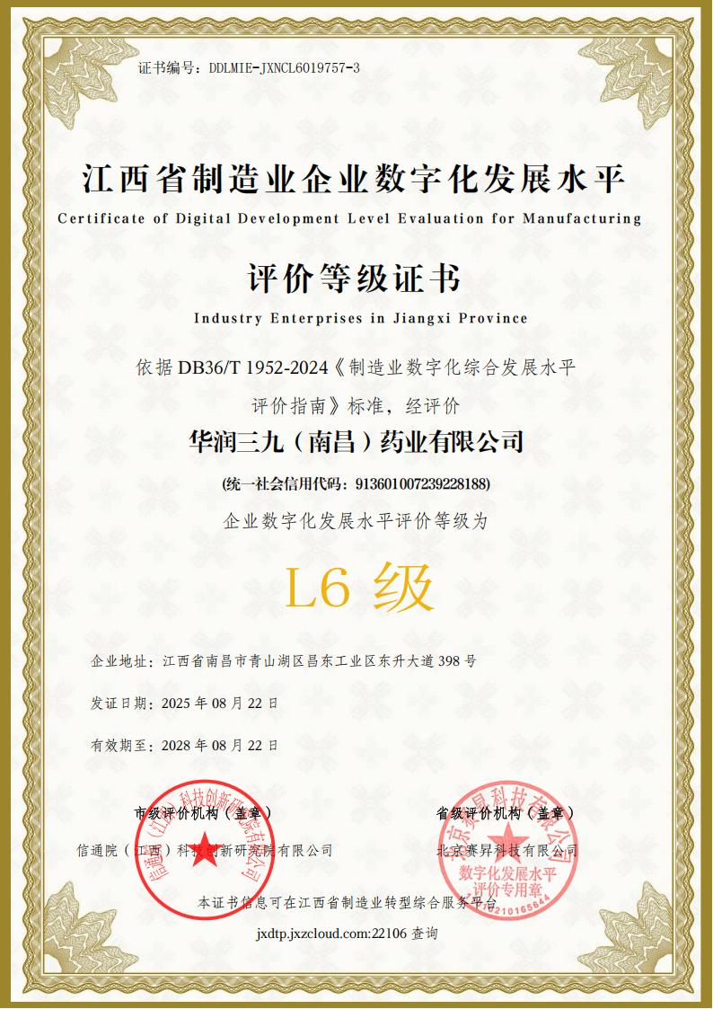 华润三九(南昌)获评江西省制造业企业数字化发展水平L6级