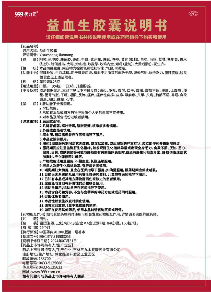 益血生胶囊说明书 请仔细阅读说明书并按说明使用或在药师指导下购买和使用 【药品名称】通用名称:益血生胶囊 汉语拼音:Yixuesheng Jiaonang